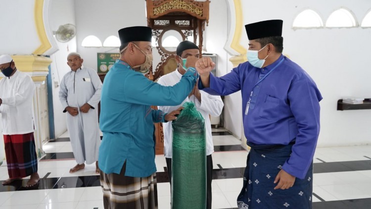 Siak - Setelah selesai melakukan pembagian sembako di Kampung Berbari Kecamatan Pusako, Bupati Siak Alfedri bersama rombongan melaksanakan shalat Jum'at berjamaah di mesjid Al-Falah, Kampung Paluh, Kecamatan Mempura, Jum’at (18/9/2020).