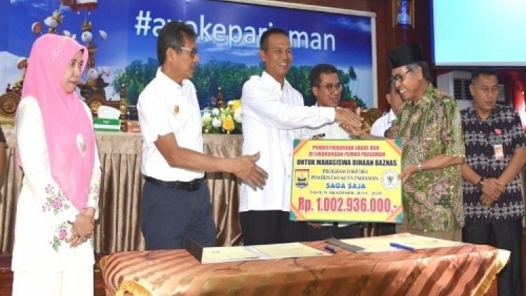 PARIAMAN,KANALSUMATERA.com -- Badan Amil Zakat Nasional (Baznas) Kota Pariaman menyerahkan Pendistribusian Zakat Aparatur Sipil Negara (ASN) di Lingkungan Pemko Pariaman untuk mahasiswa binaan Baznas Program Dinas Pendidikan, Pemuda dan Olahraga Kota Pariaman Satu Keluarga Satu Satu Sarjana (Saga Saja) tahun akademik 2019/2020, di Aula Balaikota Pariaman, Rabu (16/10/2019).
