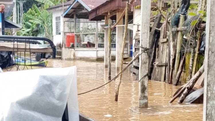 Warga setempat mengaku terpaksa berdiam diri di dalam sampan dan barang-barang yang bisa ia selamatkan di dalam sampan, karena rumahnya terendam banjir yang cukup tinggi. (SM/Inf)