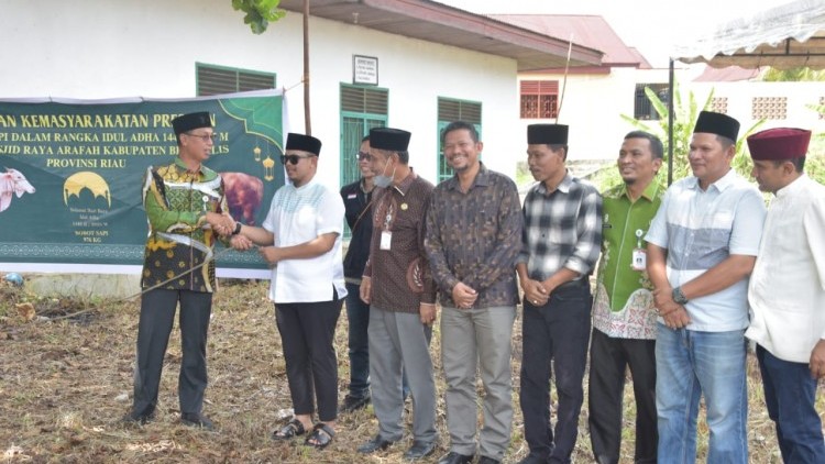DIRI, KANALSUMATERA.com -Bupati Bengkalis Kasmarni diwakili Asisten II Bidang Perekonomian dan Pembangunan H. Toharuddin menyerahkan bantuan Kemasyarakatan Presiden berupa sapi kurban untuk umat muslim di Masjid Besar Arafah Duri Kabupaten Bengkalis dalam rangka Idul Adha 1446 H/2025 M.