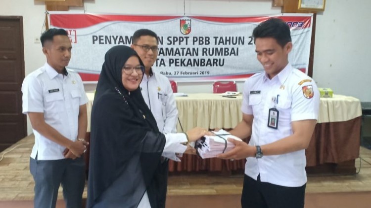 KANALSUMATERA.com - Menindaklanjuti Penyerahan Surat Pemberitahuan Pajak Terhutang Pajak Bumi dan Bangunan (SPPT PBB) dari Badan Pendapatan Daerah Kota Pekanbaru ke setiap Camat sekota Pekanbaru. Hari ini, Rabu (27/2/2019) Camat Rumbai menyerahkan sebanyak 9942 SPPT PBB kepada sembilan kelurahan diwilayahnya.