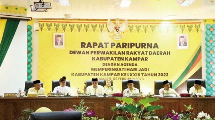 KANALSUMATERA.com - Puncak perayaan HUT ke-73 Kabupaten Kampar ditandai dengan Rapat Paripurna Istimewa Masa Sidang II 2023 di Ruang Rapat Paripurna DPRD Kampar, Bangkinang, Senin (6/2). Rapat ini dibuka Ketua DPRD Kampar M Faisal ST.