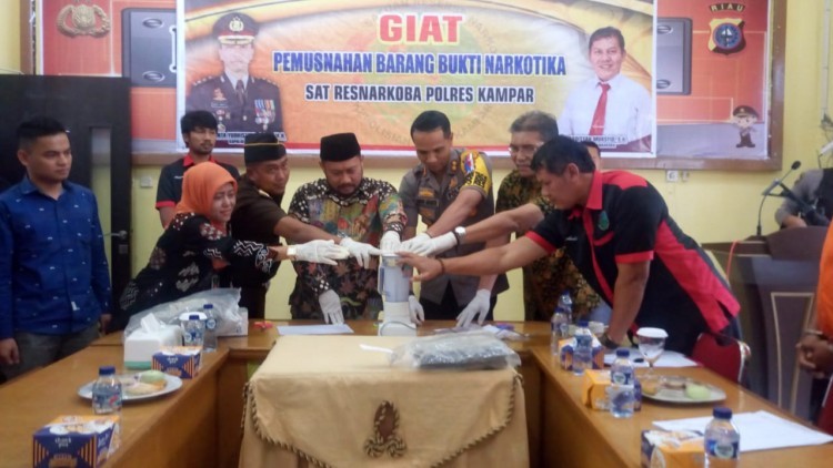 Kegiatan pemusnahan barang bukti kasus narkoba ini dipimpin langsung Kapolres Kampar AKBP Andri Ananta Yudhistira SIK MH didampingi Kasatres Narkoba Iptu Asdisyah Mursid SH.