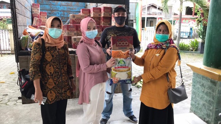 Penyaluran bantuan sembako dilakukan secara langsung oleh Lurah Kampung Tengah R Fardhania Isyaura didampingi Camat Sukajadi Rahma Ningsih, di halaman Kantor Kelurahan Kampung Tengah, Jalan Semangka, Sabtu (9/5/2020). penyaluran sembako ke warga juga di bantu Bhabinkamtibmas, Babinsa, dan PSM.