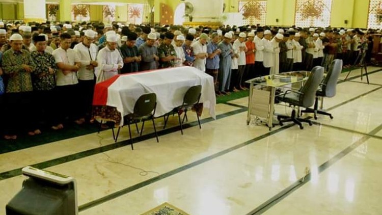 Usai seluruh yang hadir memberikan penghormatan terakhir saat upacara kenegaraan jasad Bupati Kampar H Azis Zaenal SH MM meninggalkan 1 orang istri, dan 4 orang anak, dan 10 cucu ini langsung dibawa menuju ke mesjid Al Ikhsan Islamic Center Bangkinang untuk disholatkan bersama.