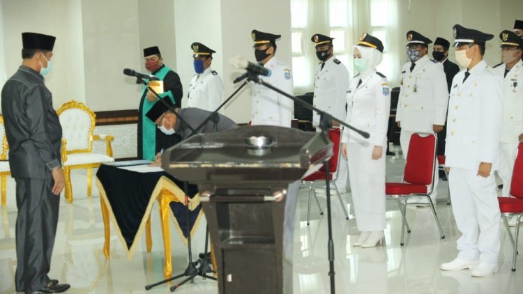 Meski dalam situasi pandemi Covid-19, tak menghalangi agenda pelantikan yang dilakukan Pemerintah Kota Pekanbaru. Setidaknya ada delapan pejabat mengenakan stelan PDH putih dan tujuh lainnya mengenakan stelah jas lengkap duduk berjarak satu meter untuk menerapkan Physical Distancing.