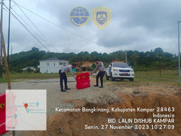 Untuk upaya keselamatan berlalu lintas, Tim Reaksi Cepat (TRC) Dinas Perhubungan Kabupaten Kampar Memasang Rambu Water Barier di sekitaran tanah amblas di Jembatan Sungai Sungsang guna mencegah terjadinya insiden berkelanjutan.