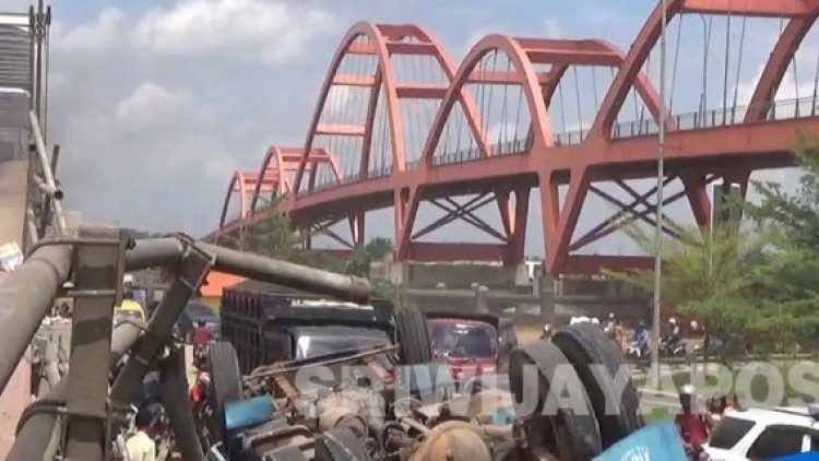 KANALSUMATERA.com - Sebuah truk pengangkut sembako jatuh terguling di jembatan Musi II Palembang, Senin (14/5/2018).